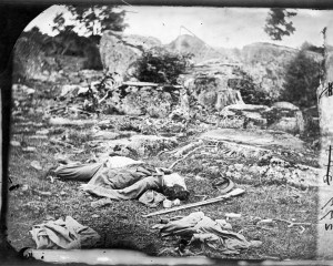 Civil War Photo (via memory.loc.gov), July 1863, Gettysburg, Pennsylvania. Soldiers’ bodies, sometimes moved and staged by photographers: