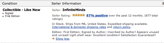 And if I still think the old ego needs to be taken down a peg or two, I can remind myself that the inscribed book has been listed there for over two years! A real “Collectible” gem. And the product description reads “appears unread.” Great! As to who I gave the book to as an inscribed gift, my guesses would be just shots in the dark. And in truth, I don’t want to know. Although the thought does creep into my mind on occasion to buy the copy myself, and then send it to the inscribee yet again, with yet another inscription that contains the phrase “you bum, you.”