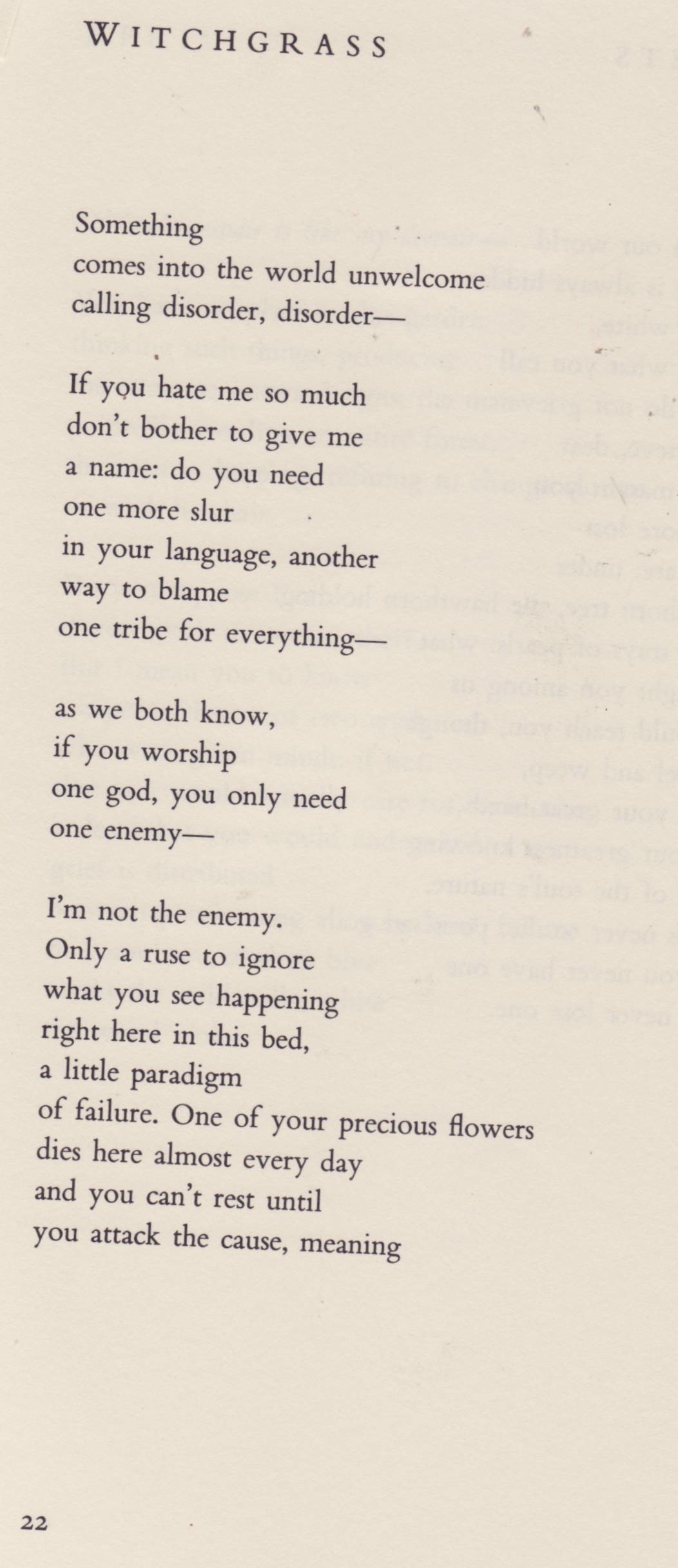 The first 3 1/2 stanzas of Louise Glück’s poem “Witchgrass,” from her collection The Wild Iris.
