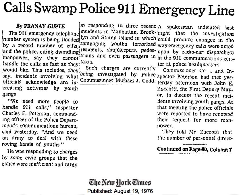 Although, by 1976, the 911 system had already been in place for years in NYC it didn’t become a fixed idea nationally until the late 70s/early 80s. Here’s a New York Times story on 911 from the year of Speedboat‘s publication: