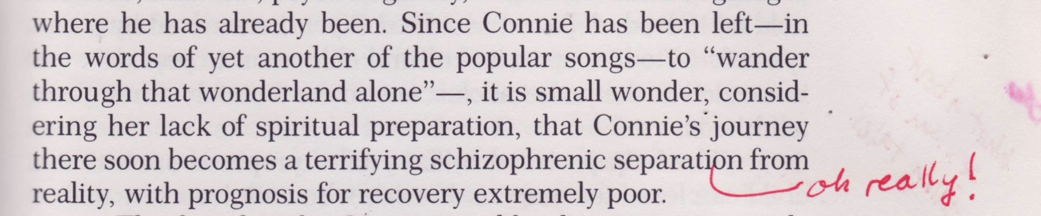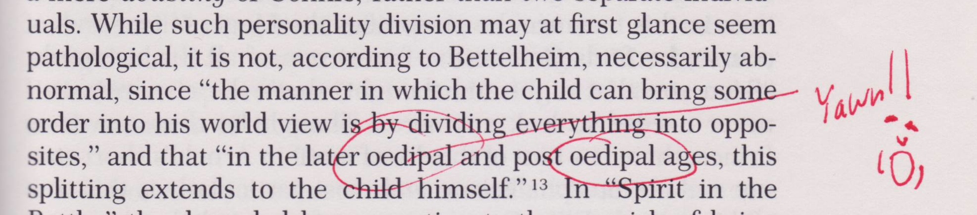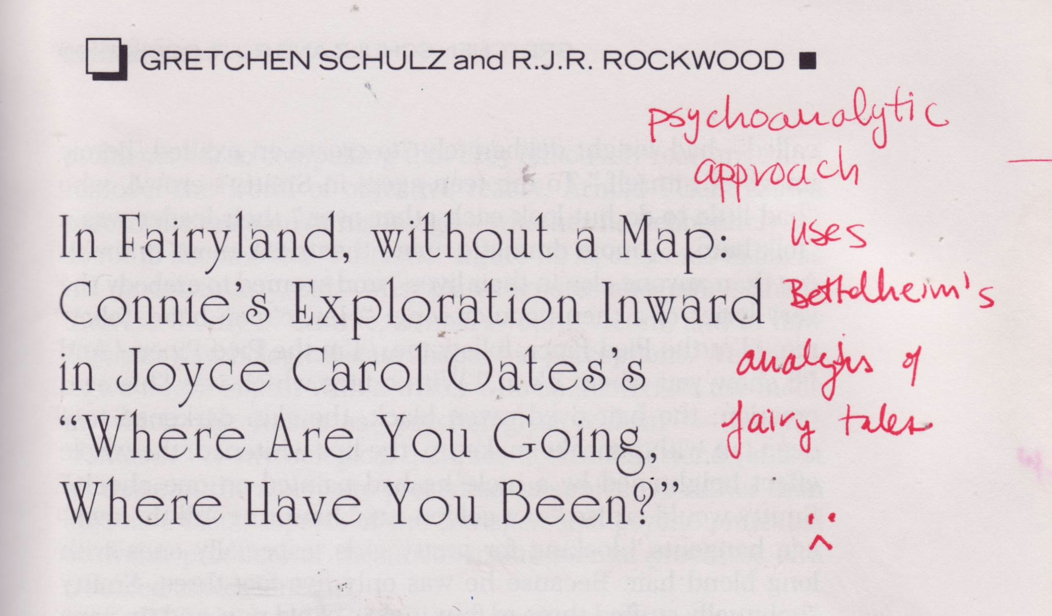 One of the reasons I buy used versions of books when I can, even when new versions are available for a better price, is the element of surprise in terms of the previous owners’ comments, markings, and doodles. This semester, in preparation for teaching Joyce Carol Oates’s 1966 story “Where Are You Going, Where Have You Been?” I ordered from an indie bookstore a copy of an edition (Rutgers University Press, 1994) of the story and critical essays edited by Elaine Showalter. Although it’s marked-up throughout in red pen, one section caught my attention: an essay by Gretchen Schulz and R. J. R. Rockwood which originally appeared, in 1980, in Literature and Pychology. It’s an interesting essay that uses Freudian literary analysis (in the way that Freudian literary analysis was often used in the 70s and 80s, a bit heavy on Oedipus) but the anonymous earlier owner of the book obviously took exception, in delightfully “mad” ways, to the essay. I’ve scanned some images and include them, below.
