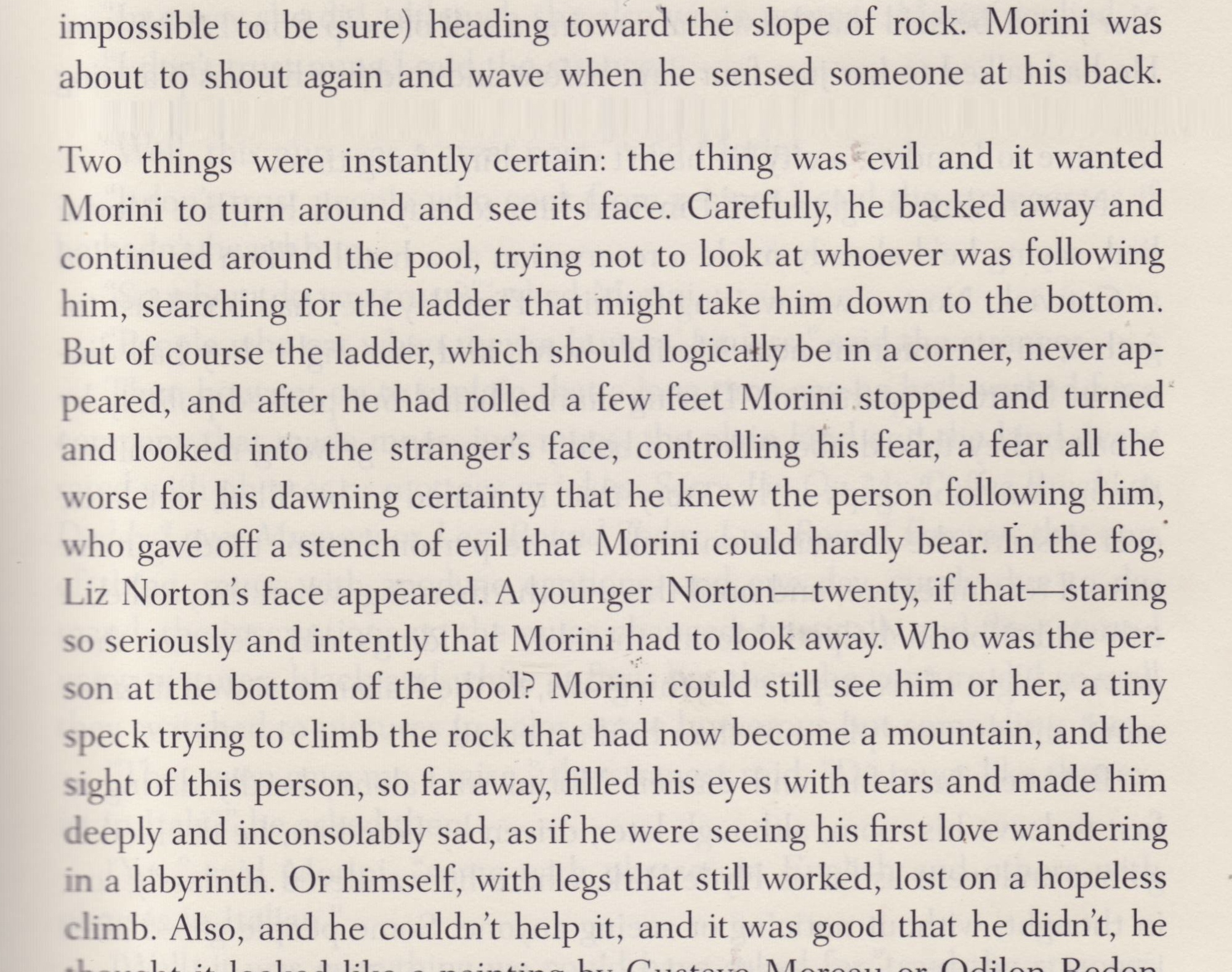 Reading Roberto Bolaño’s 2666 again (and yet again, eternally it seems, which is a sort of beautiful curse, or a curse that has no end) and there is a terror, a real terror, to certain lines, and not because of any pyrotechnic language but rather because of the direct plainness of it, as in the very early section where Morini (wheelchair-bound Morini, or perhaps faking to be wheelchair-bound, a heretical reading of the text, I know) has a nightmare about Liz Norton (“when she suffered, her pain was clearly visible”) which makes her a person to fall in love with, a person to love without honor or at least without the codes that govern love without honor, a nightmare that involves a pool (a pool governed by shadows) and Liz and Morini searching for Liz in the fog and afraid that he may topple into the pool and the line “Morini was about to shout again and wave when he sensed someone at his back. Two things were instantly certain: the thing was evil and it wanted Morini to turn around and see its face” (47). These lines, somehow, correct the world, or a perception of the world, which is to say that the evil here is not of psychology (True Detective recently pushed against this model, until its final episodes, but so much of our narrative today resolves itself around the psychology of the protagonists, as if neuro-science has become the new meta-narrative, or as if psychology were not really the individual expression of a sickness, an aberration, a cosmic aberration that includes [a thought only thought in the darkest of night: humanity itself]) but rather of something at once more cosmic and more banal, as if time itself had leaked back into the world, and in leaking brought with it the rust of pipes.) Of all the recent books (Julia Kristeva’s Powers of Horror and Mezzo and Pirus’s King of the Flies being the exceptions) 2666 comes closest glimpsing evil in both its capital E and lowercase e versions.